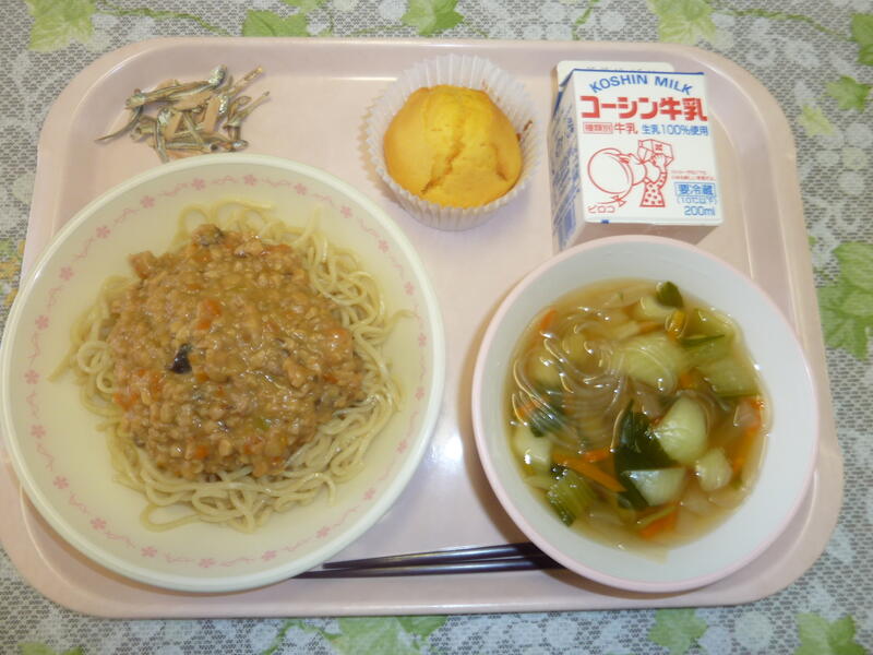 本日の給食は、ジャージャー麵、チンゲン菜のスープ、キャロットマフィン、アーモンド小魚、牛乳です。