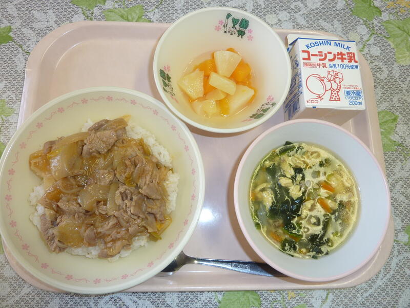 本日の献立は、豚キムチ丼、卵とあさりの野菜スープ、フルーツポンチ、牛乳です。