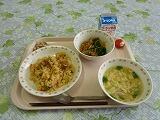 今日の献立は,韓国料理です。韓国の漬物であるキムチを入れたチャーハン,,春雨を炒めた韓国料理チャプチェです。チャプチェはやわらかく戻した春雨と細切りにした豚肉とたけのこ,同じ細切りにしたにんじん,玉ねぎ,ほうれん草などの野菜,しいたけなどのきのこ類をごま油で炒め合わせ,しょうゆ,塩,砂糖などで甘辛く味を付けるものです。