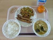 牛乳 ごはん ししゃもの唐揚げ カレーきんぴら 豆腐とわかめの味噌汁 炒り大豆 みかん