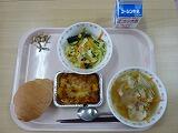 牛乳 胚芽パン じゃがいものミートグラタン コーンとわかめのサラダ 千切り野菜スープ 大豆小魚