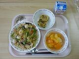 牛乳 八宝麺 柏野菜のチヂミ フルーツポンチ 小魚