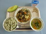 牛乳 野沢菜じゃこごはん 筑前煮 ごま仕立ての味噌汁 メロン 炒り大豆