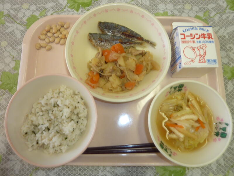 本日の献立は、わかめごはん、小アジの唐揚げ、肉じゃが、具だくさんの味噌汁、炒り大豆、牛乳です。