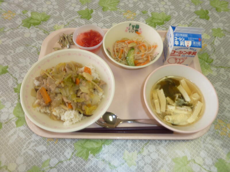 本日の献立は、中華丼、もやしと春雨のサラダ、豆腐の四川スープ、いちごミルクゼリー、小魚牛乳です。