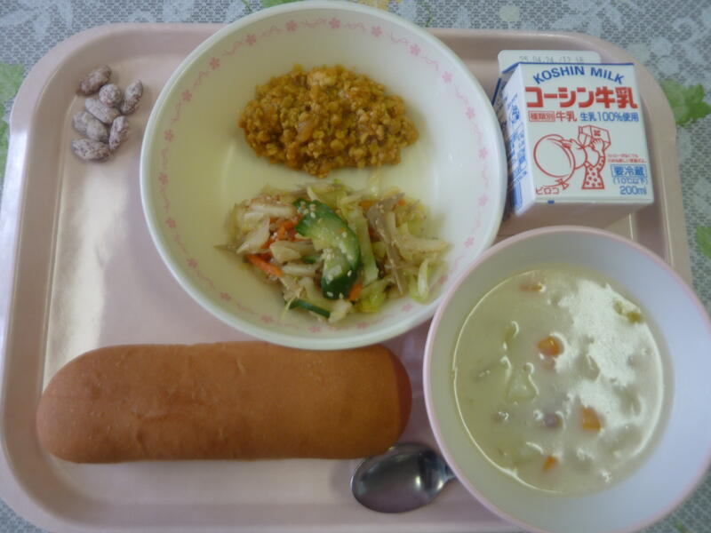 セルフカレーミートサンド、ごぼうサラダ、いんげん豆のポタージュ、白糖アーモンド、牛乳です。