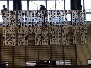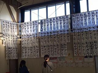 先週の「書き初め大会」で書いた作品を体育館に掲示しました。