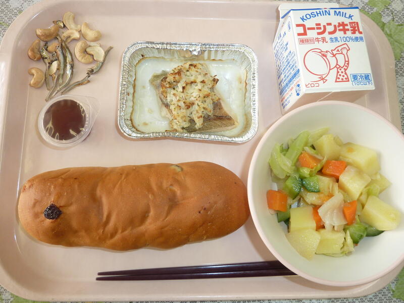 本日の献立は、ぶどうパン、鱈のマヨネーズ焼き、マセドアンサラダ、一口ぶどうゼリー、小魚カシューナッツ、牛乳です。