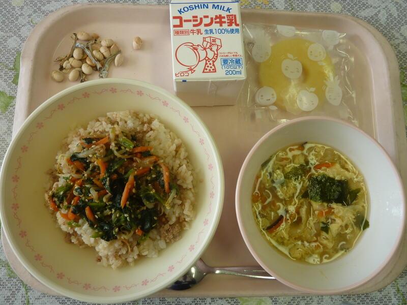 本日の献立は、ビビンバ、卵とわかめのスープ、冷凍パイン、大豆小魚、牛乳です。