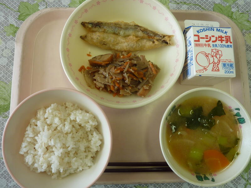 本日の給食は、ご飯、シシャモのサクサク揚げ、五目きんぴら、味噌けんちん汁、牛乳です。