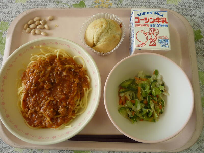 本日の献立は、スパゲティミートソース、ハニーマスタードサラダ、紅茶とリンゴのマフィン、いり大豆、牛乳です。