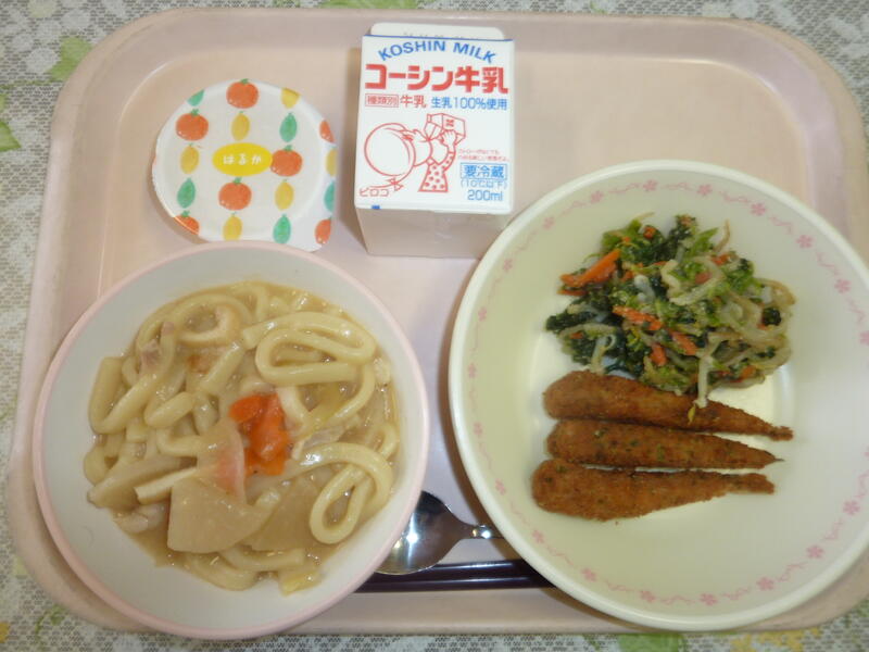 本日の献立は、みそ煮込みうどん、にぎすのあおさ揚げ、ごま和え、はるかゼリー、牛乳です。