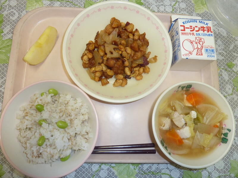 本日の献立は、枝豆とじゃこのごはん、鶏肉とさつまいもの揚げ煮、石狩汁、りんご、牛乳です。