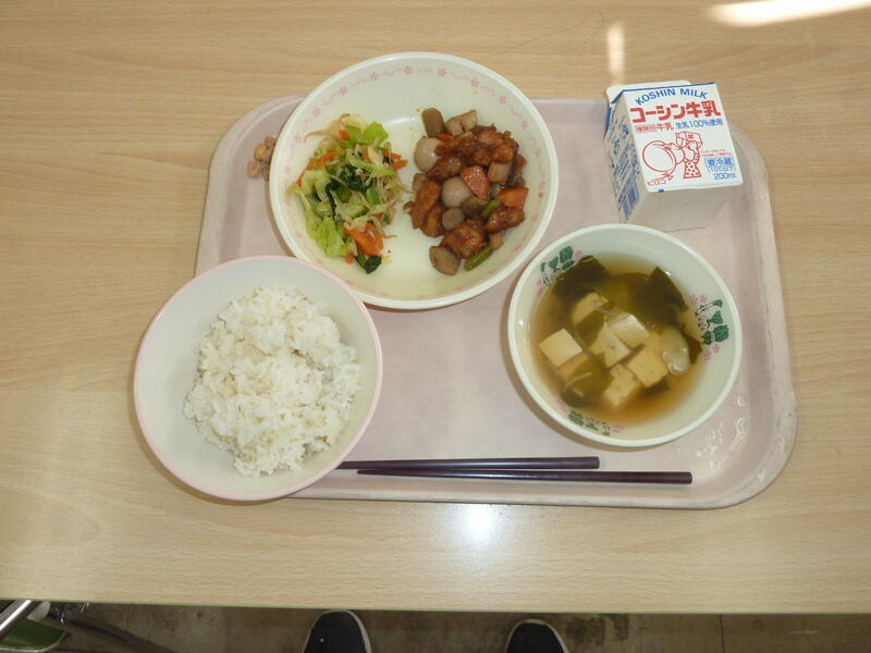本日の献立は、ごはん、鶏肉と根菜の甘辛煮、小松菜のおひたし、すまし汁、きなこ大豆、牛乳です。