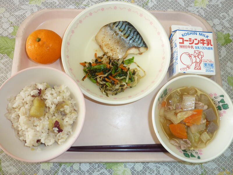 本日の献立は、さつまいもごはん、鯖のさんしょうやき、磯香和え、ごま仕立てのみそ汁、ミカン、牛乳です。