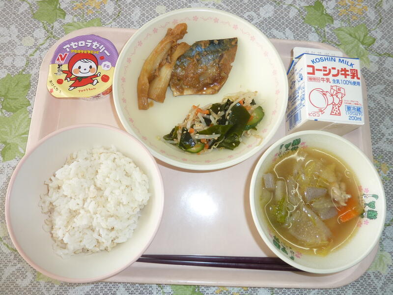 本日の献立は、ごはん、サバの味噌煮、わかめと野菜の梅和え、けんちん汁、アセロラゼリー、牛乳です。