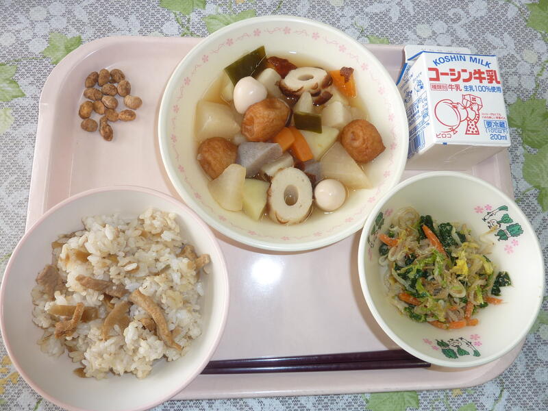本日の献立は、具多肉のしぐれ煮ごはん、おでん(うずらの卵入り)、胡麻和え、黒糖ビーンズ、牛乳です。
