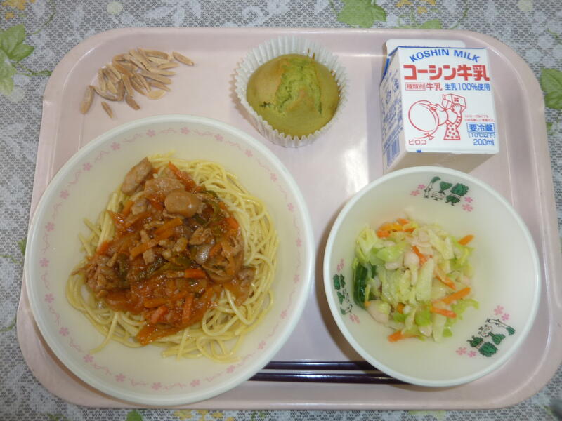 本日の献立は、スパゲティナポリタン、いんげん豆のカラフルサラダ、手作り抹茶豆乳マフィン、アーモンド、牛乳です。