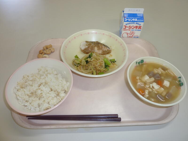 本日の献立は、ごはん、メルルーサのごまだれ焼き、おひたし、けの汁、カシューナッツ、牛乳です。