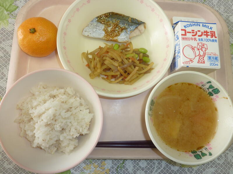 本日の献立は、ごはん、さわらのごまみそ焼き、カレーきんぴら、かぼちゃ汁、ミカン、牛乳です。