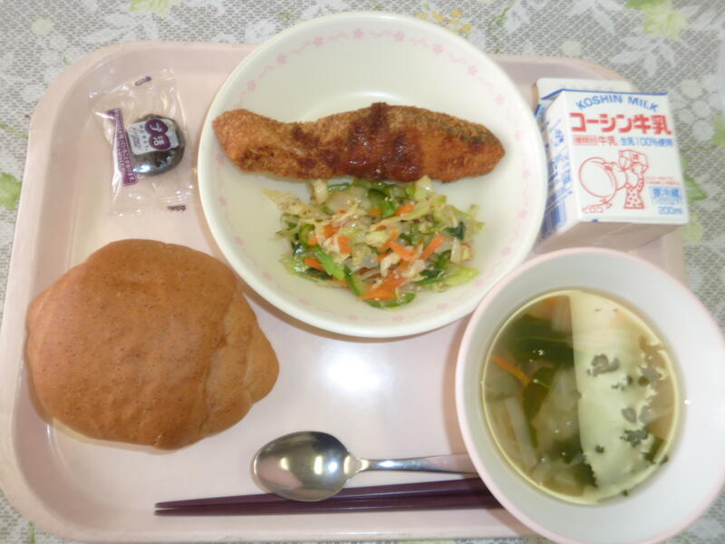 本日の献立は、胚芽パン、鮏フライ、バジルドレッシングサラダ、ABCマカロニスープ、プルーン、牛乳です。