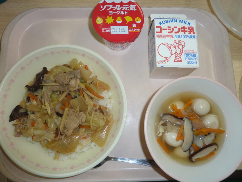 本日の献立、回鍋肉丼、うずらの卵入り五目中華スープ、ヨーグルト、牛乳です。