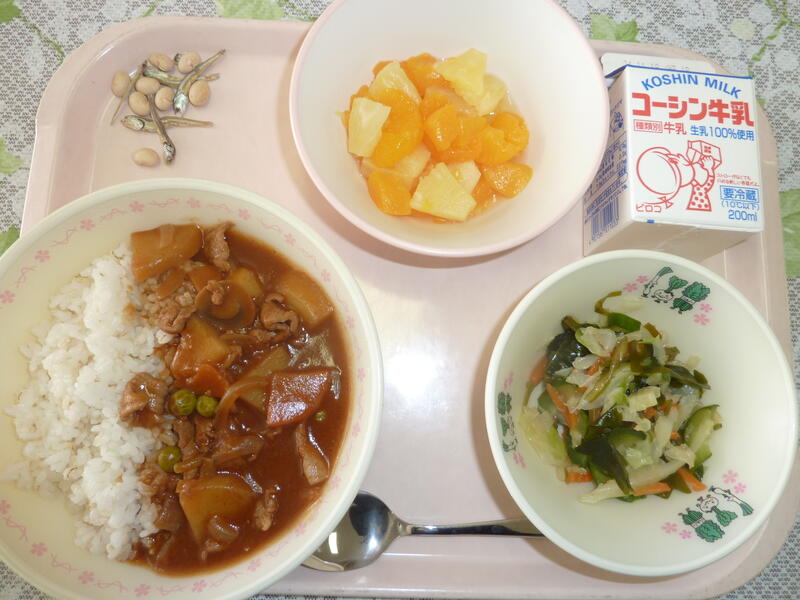 本日の献立は、ハヤシライス、フルーツ和え、海藻サラダ、大豆小魚、牛乳です。