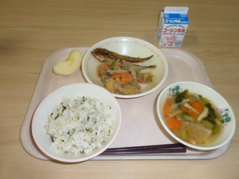 本日の献立は、わかめごはん、ししゃものから揚げ、肉じゃが、大根のみそ汁、りんご、牛乳です。