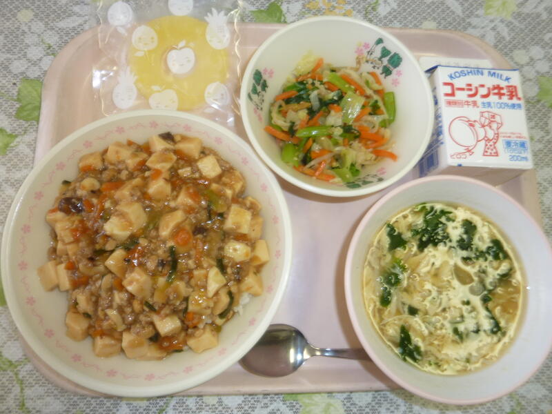 本日の献立は、マーボどうふ丼、ナムル、中華卵スープ、冷凍パイン、牛乳です。