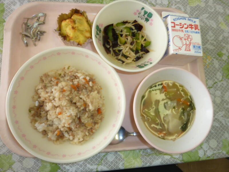 本日の献立は、チャーハン、きくらげの中華あえ、みそワンタン、スイートポテト、小魚、牛乳です。
