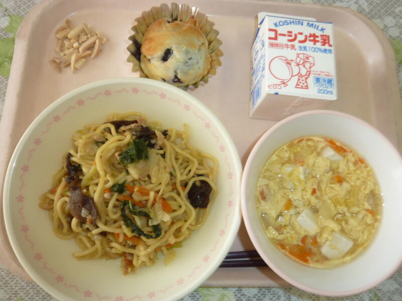 本日の献立は、上海焼きそば、豆腐と卵の中華スープ、ブルーベリーケーキ、アーモンド、牛乳です。