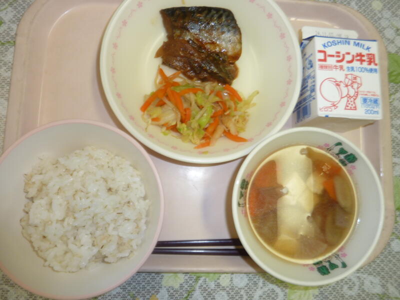 本日の献立は、ごはん、サバの味噌煮、きゅうりのゆず和え、けんちん汁、牛乳です。