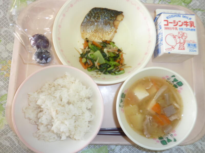 本日の献立は、ごはん、さばのカレー焼き、磯香あえ、豚汁、巨峰、牛乳です。