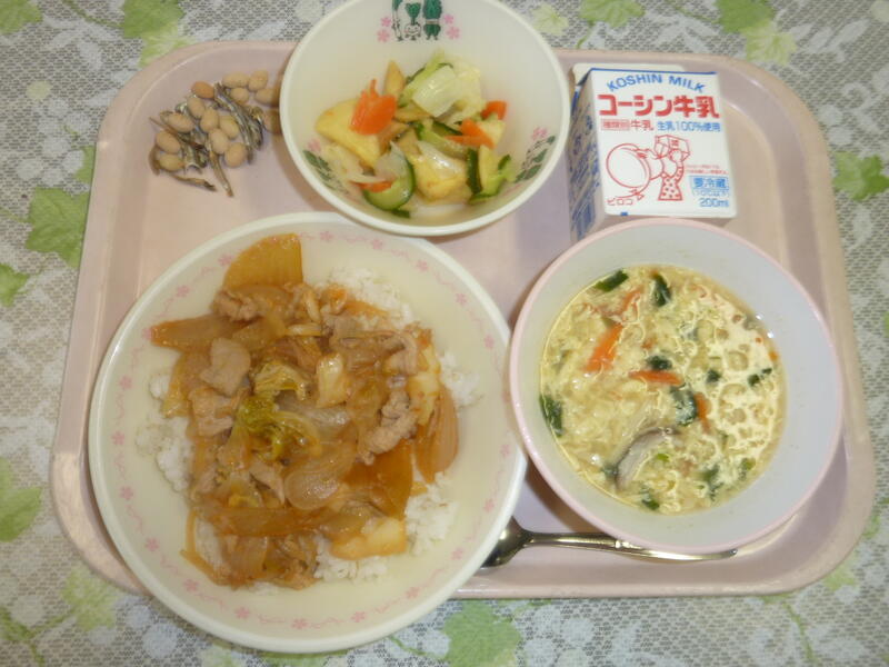 本日の献立は、豚キムチ丼、卵入り五目中華スープ、揚げじゃがいものサラダ、大豆小魚、牛乳です。