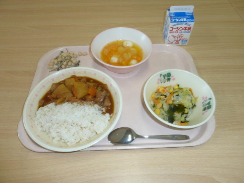 本日の献立は、ポークカレーライス、わかめとコーンのサラダ、フルーツポンチ、大豆小魚、牛乳です。