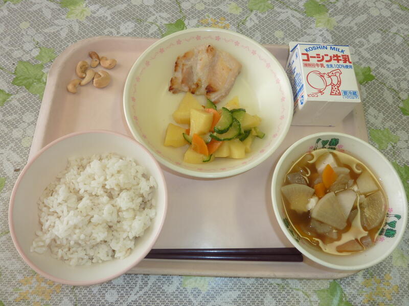 本日の献立は、ごはん、鶏肉の塩麹焼き、じゃがいものみそサラダ、けんちん汁、カシューナッツ、牛乳です。