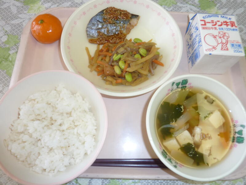本日の献立は、ごはん、みそ焼きみそ焼き、カレーきんぴら、うずらの卵入りすまし汁、冷凍ミカン、牛乳です。