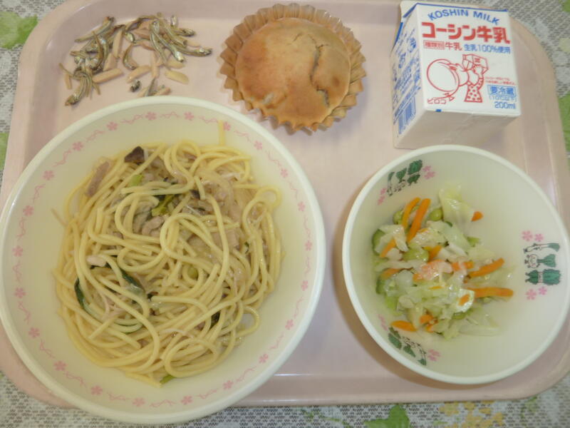 本日の献立は、しめじの和風スパゲティ、梅ドレッシングサラダ、梨ケーキ、アーモンド小魚、牛乳です。