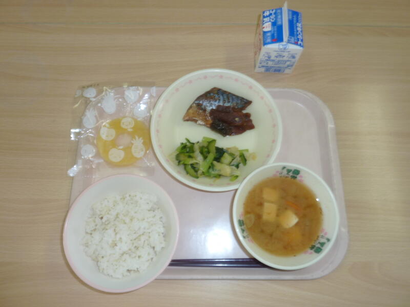 本日の献立は、ごはん、鯖の生姜煮、ピリ辛あえ、かぼちゃ汁、冷凍パイン、牛乳です。