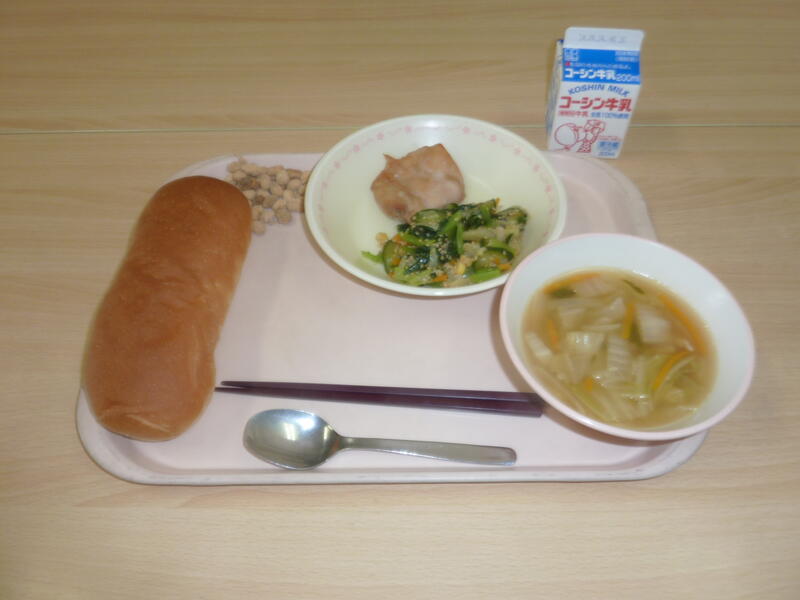 本日の献立は、コッペパン、鶏肉のマーマレード焼き、ABCマカロニスープ、バジルドレッシングサラダ、きなこ大豆、牛乳です。