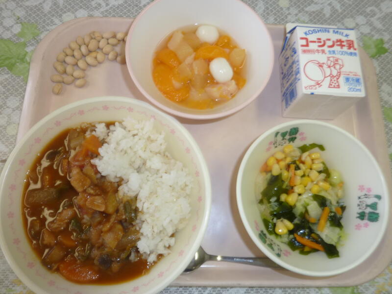 本日の献立は、夏野菜のカレーライス、わかめとコーンのサラダ、フルーツ白玉、炒り大豆、牛乳です。