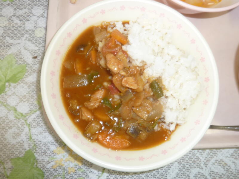 夏野菜のトマト、かぼちゃ、なす、ピーマンなどを入れた夏野菜カレーです。