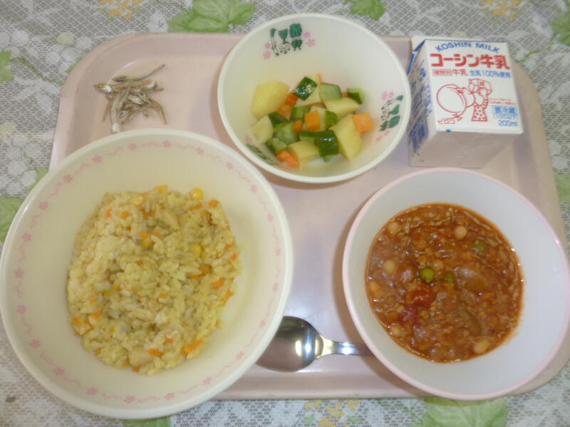 本日の献立は、カレーピラフ、豚肉と豆のトマト煮込み、マセドアンサラダ、小魚、牛乳です。