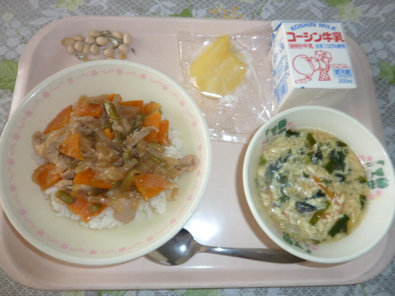 本日の献立は、スタミナ豚丼、卵とワカメのスープ、冷凍りんご、大豆小魚、牛乳です。