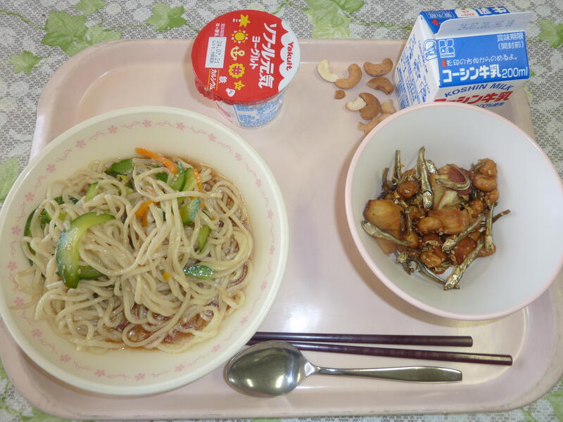 本日の献立は、冷やし中華、大豆と小魚の揚げ煮(芋いり)、ヨーグルト、カシューナッツ、牛乳です。