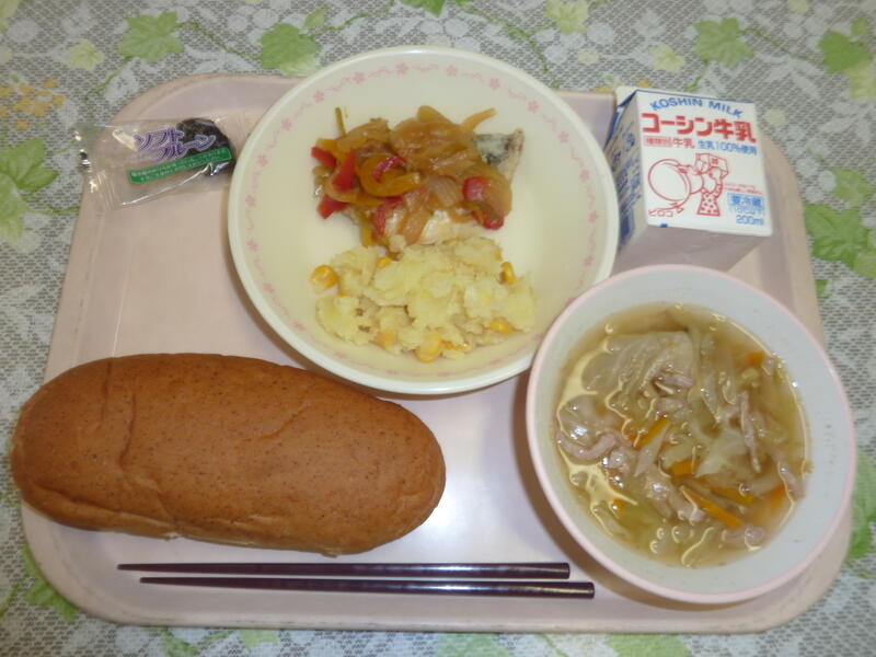 本日の献立は、ブランコッペパン、あじのエスカベッシュ、コーンポテト、キャベツとベーコンのスープ、プルーン、牛乳です。