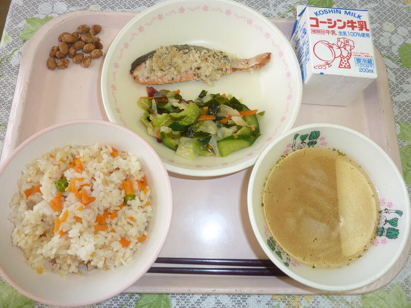 本日の献立は、にんじんピラフ、鮭の香草焼き、海藻サラダ、オニオンスープ、黒糖ビーンズ、牛乳です。
