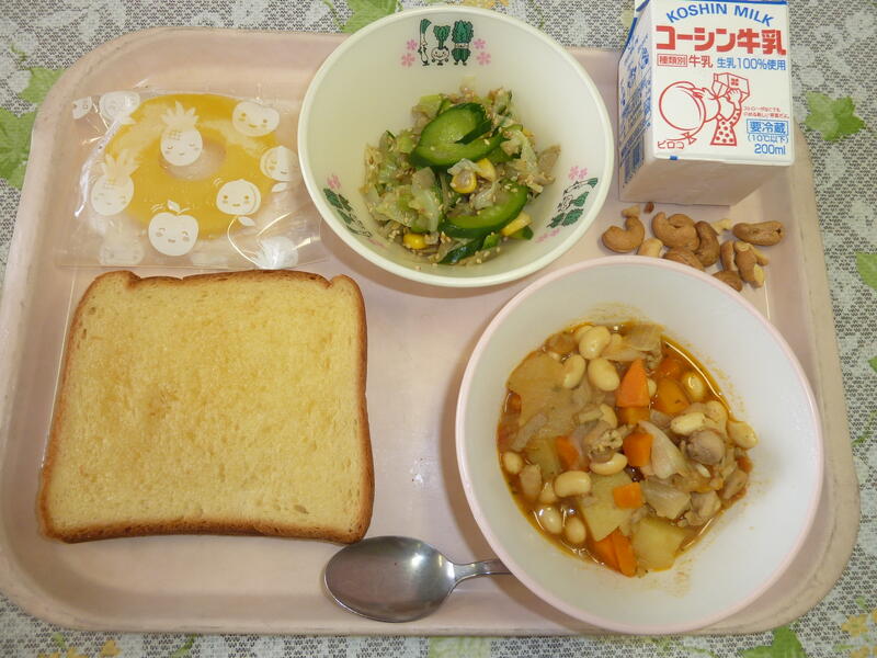 本日の献立は、ハニーレモントースト、鶏肉と大豆のカレー煮込み、ごぼうイタリアンサラダ、冷凍パイン、カシューナッツ、牛乳です。