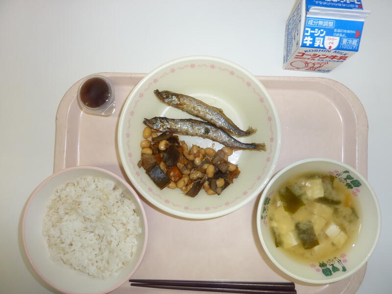 本日の献立は、ごはん、ししゃものいそべ揚げ、五目豆、じゃがいものみそ汁、一口ぶどうゼリー、牛乳です。