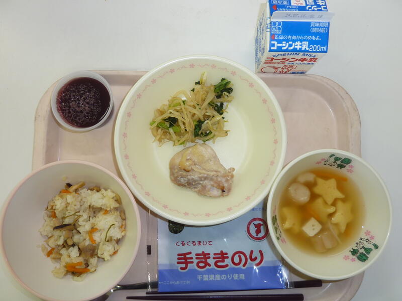 本日の献立は、七夕手巻き寿司、鶏肉の塩麹焼き、小松菜のおひたし、いずら卵入りそう麺汁、七夕ゼリー、牛乳です。